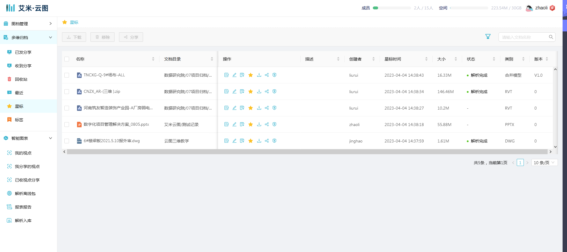 点击 【星标】菜单,文档列表中展示用户添加星标的文件。