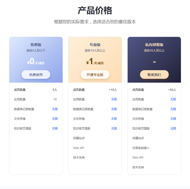 | 功能特权 | 免费会员版 | 普通会员版 | 高级会员版 | 企业版 | 私有部署版 |